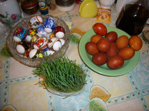 раньше из ритуальных штук, которые должны были присутствовать на праздничном пасхальном столе, были ещё пророщеные зёрна пшеницы - трава, и агнец из масла.