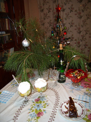 Ужинаем как обычно, ну что-нибудь готовим, конечно, не вполне будничное, а к полуночи накрываем стол с десертом, обычно это шампанское, торт, фруктовый десерт со взбитыми сливками, что-то типа этого.