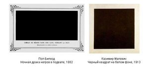 1 октября 1882 поэт и, как бы сейчас сказали, гмм... актуальный художник Пол Билход (Paul Bilhaud) представил парижской публике свою работу "Ночная драка негров в подвале". Потом был Альфонс Алле, тоже не художник, со своими "Апоплекcическими кардиналами, собирающими помидоры на берегах Красного моря" (до "Красного квадрата" Малевича еще больше 30 лет) и "Малокровными девушками, идущими к первому причастию в снежную бурю" (до "Белого на белом" все того же Малевича еще 35 лет).