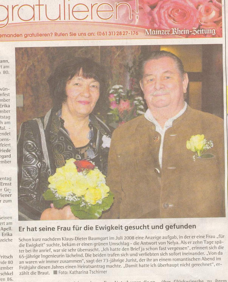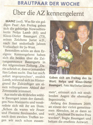 Ну в общих чертах - мол, из многих объявлений Клаус выбрал Нэлю из Новосибирска, и ответил ей через 10 дней, а она уже и забыла, что писала :-) (Ага, как же, забыла она - прим. моё) И, мол, после пары встреч они решили жить вместе, а потом он ей сделал предложение. И писал он не куда-либо и не как-либо, а именно в газету "Альгемайнунг цайтунг", что в Майнце выпускается.