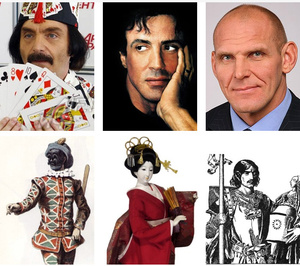 левый внизу - арлекин. Под Сталоне созвучно пришло на ум Панталоне. третьего уже так добавил. По изображениям хз - не скажу. Так что, скорее всего, анаграммы)