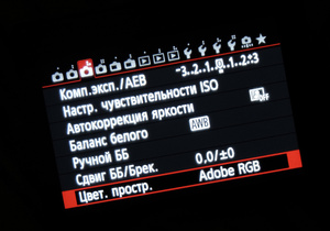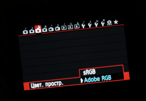 жмешь МЕНЮ. там в настройках режим фотоаппарата (значок фотоаппаратика) и там смотришь как на картинке.. снял со своего аппарата, у тебя может немного отличаться, но ищи Цветовое пространство и там выбираешь нужное.. по умолчанию сРЖБ, но я ставлю Адоб, потому что все прогоняю через ФШ и мне это нужнее
