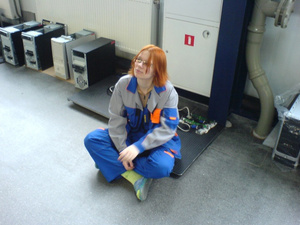 А вот дока такая вот долговязая, динноногая рыжая в рокерской косухе, со здоровенным инструментальным ящиком в одной руке и макитой на плече. И папироской в зубах.