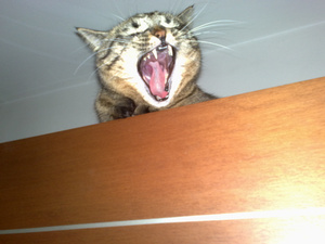 да-да, он артистическая натура) творческий кот, и бесстрашный. Например, когда у него была неделя "свободу-попугаям", он пару раз ходил спать в корзину для далматинца соседского, который его чуть не погрыз в прошлом годе - в отсутствие и далматинца и его хозяев, ясное дело.). Корзина большая, плетеная, с матрасом, стоит под навесом - такой отель трешка, что еще нужно одинокому коту?))))