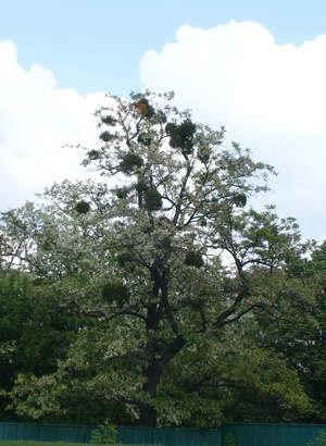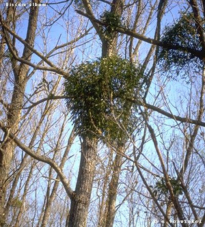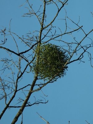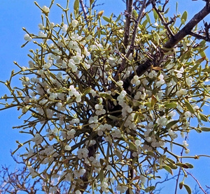 Но оказывается, эти шары - это такое растение-паразит, оно поселяется на деревьях, называется ОМЕЛА. Оно имеет разновидности, выражается это в виде формы листьев и цвета ягодок. В Калининграде в основном, как мне сказали, омела имеет округлые листики и белые ягоды, а южнее произрастает омела со специфическими фигурными листиками и красными ягодами.