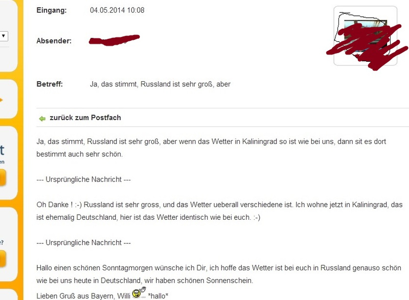 "Привет, я желаю тебе прекрасного воскресного утра , надеюсь, что в России такая же погода как у нас в Германии, у нас сегодня прекрасное солнышко. Любезный привет из Баварии, Вилли."