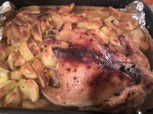 О, Алинка, гляди. Вполне так обычное семейное вечернее блюдо каркура. Изящное название, правда? Мы с крокодилами придумали! Так называется молодая охлажденная курочка, выращенная на восточных склонах Салаирского кряжа престарелыми пухлыми девственницами-республиканками, носящих фамилии, оканчивающиеся на "ич" и проповедующими идеи раздельного питания. Картошка местная, красного сорта. Приготовление проводилось способом "закрытая дверцей духовка" с четырьмя режимами: "только верх", "только низ", "сильно верх-низ" и "слабо верх-низ". В качестве подложки использована фольга обыкновенная кулинарная тонкая нагло шуршащая. Приправы: соль, травки разные и чеснок.