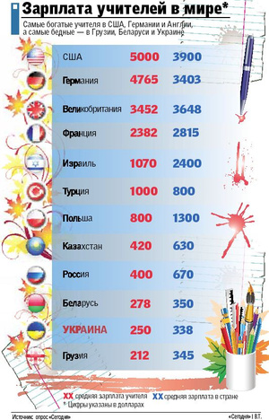 Мы решили выяснить, как живется педагогам в других странах. Оказалось, что в Турции учителей настолько уважают, что даже целуют им руки. А вот израильские педагоги вынуждены бастовать из-за низких зарплат. Их доходы, как и украинских коллег, в 2 раза ниже, чем средние по стране. Лучше всех живется немецким учителям. которые в месяц приносят домой 4500 долларов и могут себе позволить кататься по всему миру. Вот бы и нашим так!