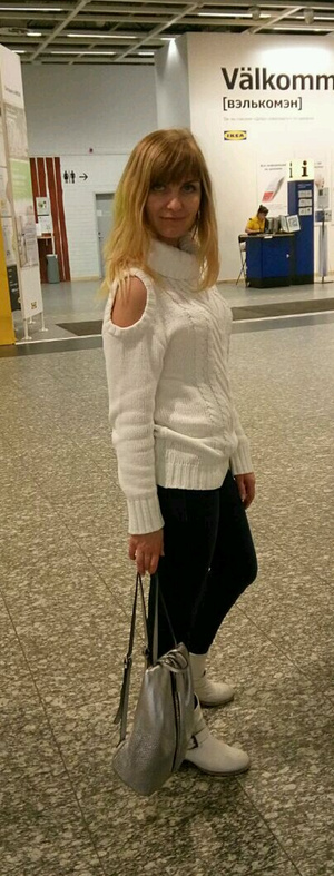 начнем с того, что там ботики, а не сапоги, свитер совершенно по размеру, в водолазке в облипку я бы элементарно замерзла) пуховик в облипку - вообще крайне странен