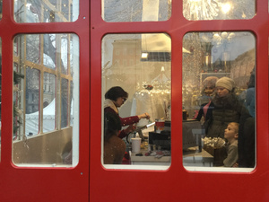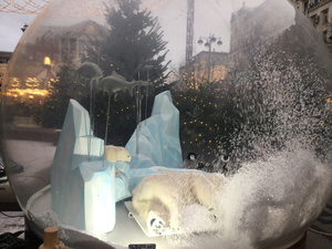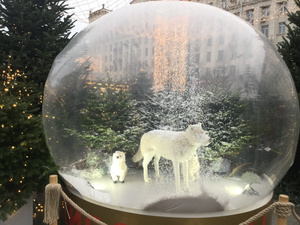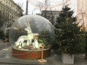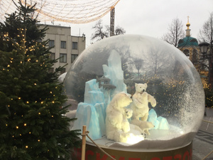 Фигуры в шарах шевелятся, вот до чего техника дошла. И периодически поднимается « снежная буря». А в домике мастер-класс стеклодува