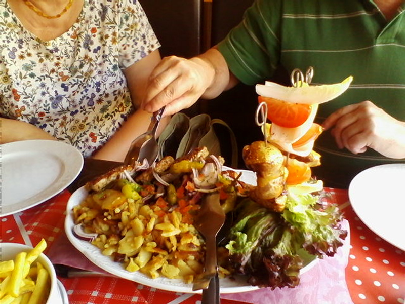 Они взяли на двоих блюдо с тремя сортами мяса гриль, а я судака. Фантазия тамошнего повара меня насмешила, а НМ сказал, мы просили на двоих, а не на пятерых ))
