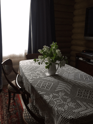 скатерть была спасена мной от выброса.. То есть это было покрывало (к нему и накидка на горку из подушек прилагалась), связанное вручную крючком лет тридцать назад. Покрывать мне нечего, а вот как скатерть очень даже.