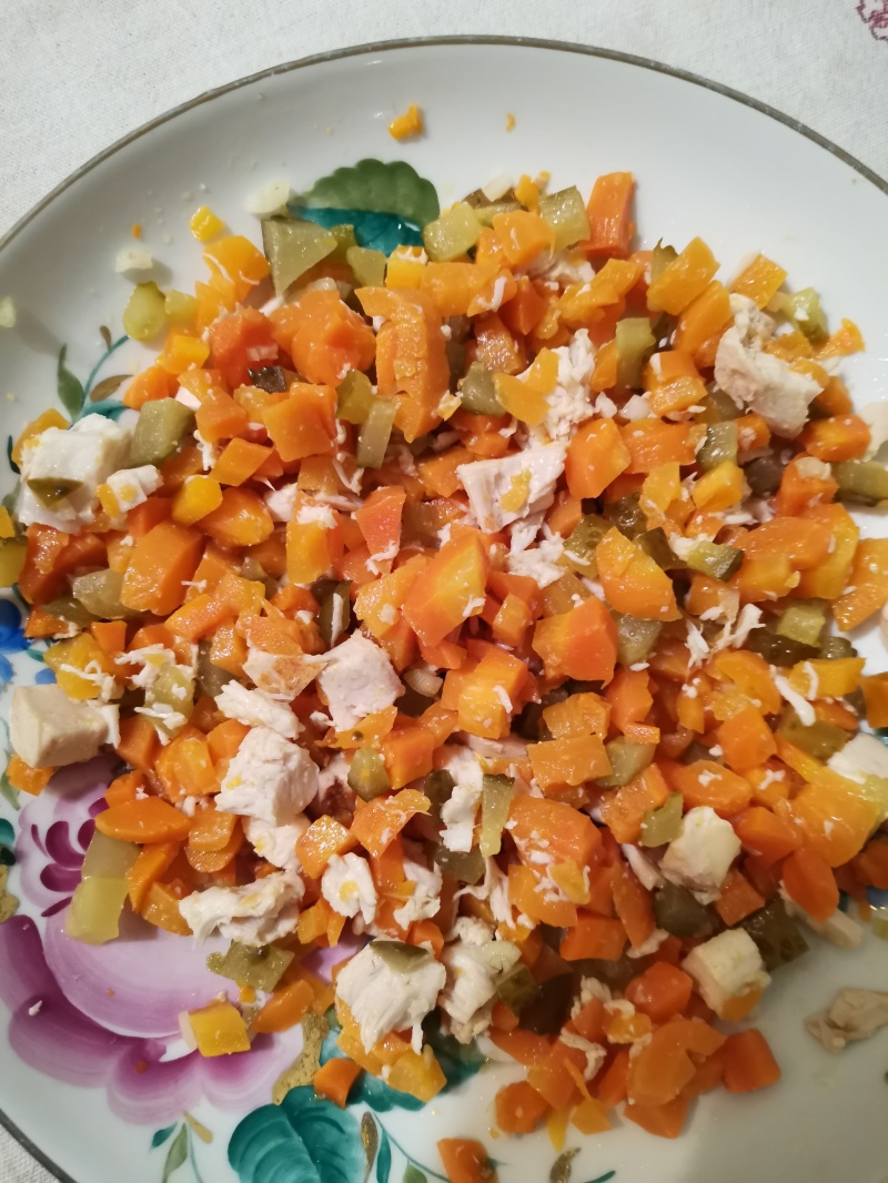 Нарезала кубиками собственно выращенные отварную морковь, солёные огурчики, нашинковала небольшую луковицу, грудку курицы гриль и заправила подсолнечно-оливковым маслом.