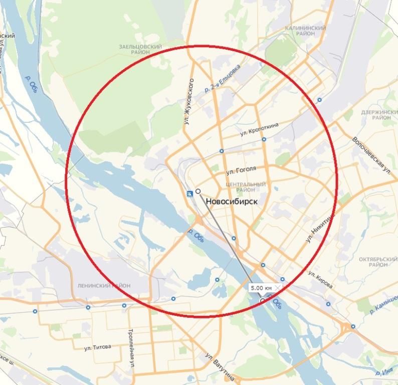 В Дубль ГИС открываешь карту Новосибирска и отмеряешь дугу в 5 км (этой цифрой ограничил автор). И смотришь кто живет на данной территории. Ведь таких совсем немного, всего несколько человек.
