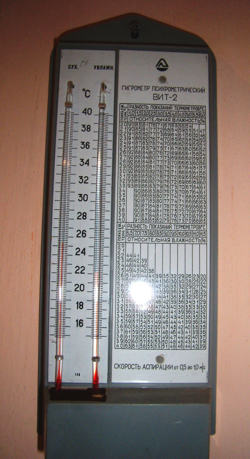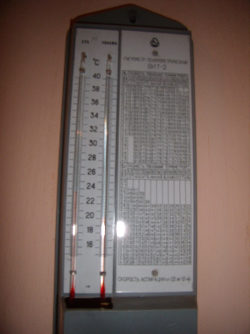 Сухой термометр показывает примерно 25, влажный - примерно 22 градуса.