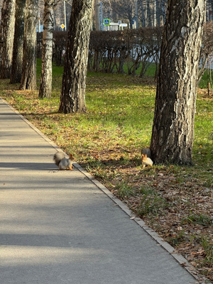 Белки такие же, могут на дороге встать на задние лапы и не пропускать без орехов. Могут по голове пробежать и игнорируют что я вообще-то царь природы.