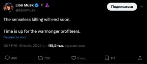 Маск: Скоро бессмысленным убийствам придет конец. Время поджигателей войны вышло.