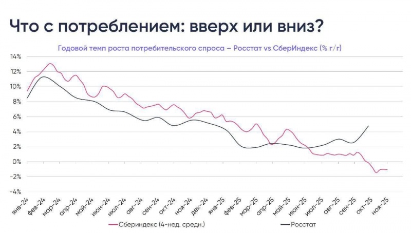 Еще нашла интересный график - сопоставили данные от Росстата и Сбербанка, который измеряет потребительскую активность по реальным покупкам россиян (так называемый "Сбериндекс"). Если раньше обе кривые были синхронизированы, то в октябре стали расходиться. Сбер показывает резкое падение активности потребителей, а Росстат — резкий рост. Вывод - в октябре Росстат решил маленько подлакировать действительность.