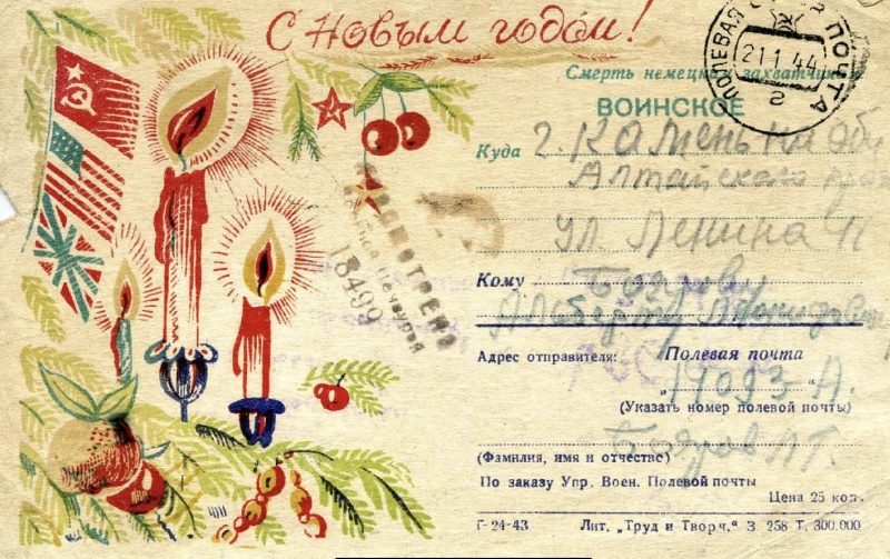 На п.п. Смотрела канал про советские новогодние открытки, попалась любопытная, с фронта, 1944 года, в Камень-на-Оби. Транслирует современное открытке восприятие.