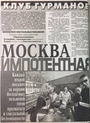о даУникальные пельмени восстанавливающие сексуальную активность разработал Бирюлевский мясокомбинат. Чтобы получить бесплатную порцию, москвичам достаточно было признаться в своей импотенции. 1998 год