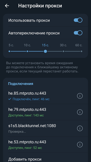 С прокси телега работает, но видео подгружает медленно. Прокси несколько и я их подгружаю. Сегодня пинг меньше 100.у меня сегодня в меню было довольно много 110-130 только один прокси нашел 99 мс