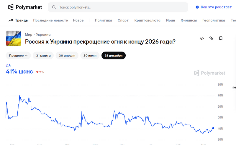 два процента на полимаркет если к 31 марту, а вот на декабрь 2026 то шансы выше - 41%