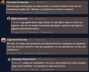 Боты писали про «неполадки на несколько минут», «безопасность», «стабильность» и белые списки. Также ботам было «мерзко смотреть на зумеров, который ноют, .. (что) не могут залить новый свой видос» и отдельно они перевозбудились от новостей про пейджеры — «смысла нет», «бред» и «они уже не работают».