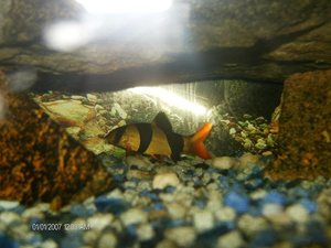 Это боция-клоун, семейство вьюновые. Я хотел себе таких, но потом передумал. Говорят, они в содержании прихотливые очень, ихтиком болеют часто, а лекарство от ихтика плохо очень переносят.