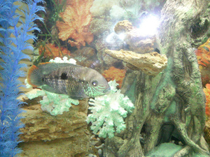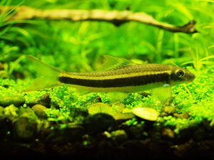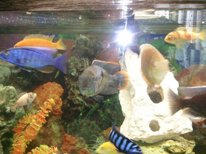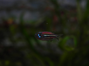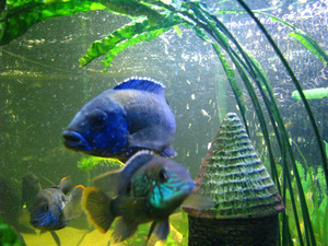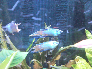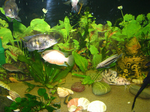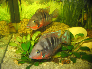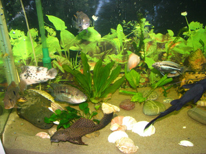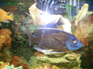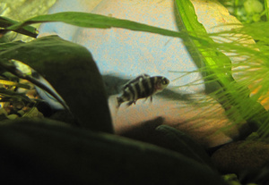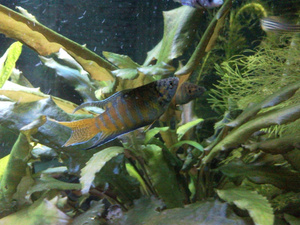 южноамериканская цихлида. имхо, кто-то из рода Geophagus или Gymnogeophagus. возможно, самка.Рыбёшке около двух лет, сначала была серенькой, невзрачненькой, а сейчас вот такая красотка выросла, совсем не агрессивная. В длинну 13-15 см. в висоту 5-6 см.