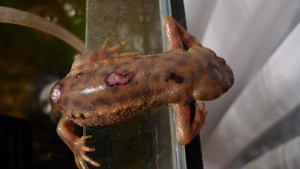 мне кажется, что его надо отсадить временно,есть куда? надо еще посмотреть как его лечить, наверняка есть где-нибудь описание болезней тритонов.