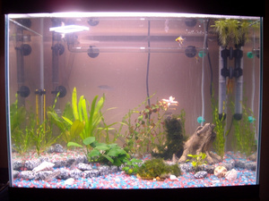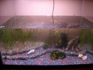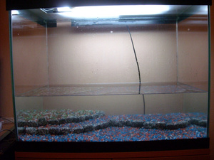 В течении недели аквариум постепенно заливался водой (по ведру в день, не отстаивая). Свет включен часов по 12 в сутки, круглосуточно работал аэратор, обогреватель не использовался.