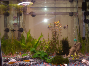Вот так выглядит аквариум сейчас. С начала запуска прошел месяц. Что в результате? Рыбки чувствуют себя превосходно. Практически все растения прижились и пошли в рост. Стрелолист и валлиснерия дали корневые побеги. Валлиснерия уже с маленькими детками, хотя первоначальные кустики почти не изменились. Мох разросся, пошли в рост новые листочки и корешки у анубиаса. Непонятно пока с эхинодорусом, вроде растет лист, наблюдаю.