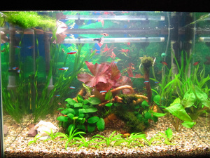 1) вода мутновата (от тетровских удобрений). не очень качественно заливал воду, из грунта немного удобрений замутило воду