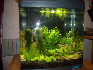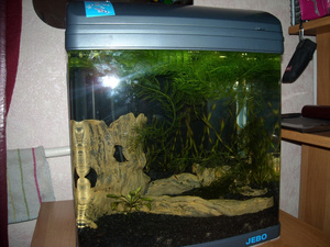 Фирменная банка JEBO. Водозаборник под грунтом, биофильтр в крышке, 20 литров, лампа Т5 8Вт. Чего сразу не понравилось? Помпа торчит ни к селу, ни к городу, да еще и блескучей, хорошо приклеенной этикеткой спереди. Ужос.Это к тому, что не нравятся мне инородные предметы в аквариуме, и если уж приходится чего-то помещать, то надо стараться спрятать.