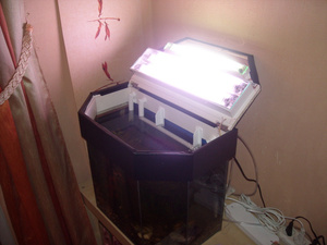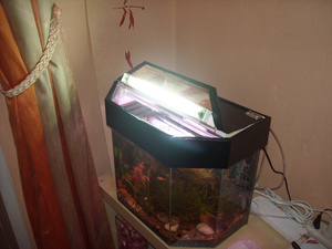 Что получилось: 2 лампы Т8 по 14Вт + 1 лампа Т5 8Вт. Лампы с отражателями закрыты стеклом. В периметр крышки вмонтированы водозаборник для фильтра и флейта, а также трубочка для присоединения распылителя воздуха. СО2 в этот аквариум пока не планируется. ЭПРА для ламп выведены наружу. Сами ЭПРА выдернуты из энергосберегаек соответствующей мощности. Крышка составная. можно открыть так: