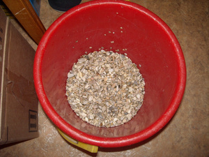 Отделяем где-то одну четверть, а к большей часть добавим пару ложек удобрения. Вообще-то и ложки должно бы хватить, но по опыту часть удобрения останется на стенках ведра при перемешивании, да и пусть побольше будет. Тщательно мешаем с мокрым грунтом, потом немного ждем, еще мешаем, пока не разойдутся все комочки.