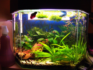 живут четыре петушка (самец и 3 самки), 6 сомиков-пигмеев, 4 розовых данио-рерио, 2 отоцинклюса, 1 SAE, несколько креветок-вишен, куча мелких улиток-физ, для борьбы с которыми запущены совсем недавно 4 улитки хелены.