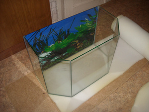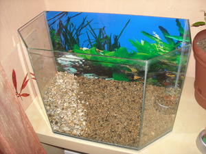 Аквариум достался по обмену. Вроде 35л. Вот он, с уже наклеенным фоном готовится к вырезанию подложки.
