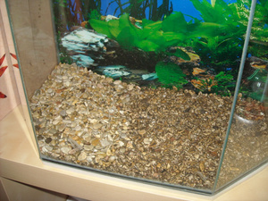 Во-первых досыпаю оставшийся грунтВо-вторых, сыплю "Кварц горный обкатанный" где-то около полутора килограмм. По поводу кварцевого грунта. В инете мнения противоречивые по его поводу для использования в аквариуме. Но я рискнул, ибо он довольно мелкий мелкий, что важно для растений с слабой корневой системой, а садить буду бликсу, возможно потом еще и глоссостигму. Ну и вроде как кварц содержит много железа, но это мне тока на руку, вернее, глоссостигме