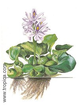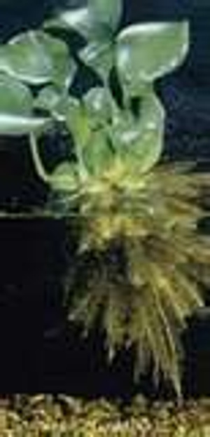 Растение слева - это эйхорния прекраснейшая или водянной гиацинт. Весь прикол в том, что это плавающее растение (см. аттач), а его в грунт закопали!