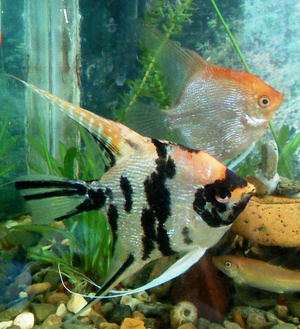 Поменяем скалярия золотого, чуть больше года, предположительно мальчика (на фото сзади), на скалярию девочку желательно мраморную полосатую( как на фото спереди)