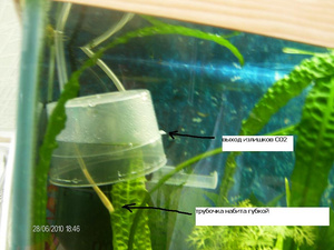 подача со2 сверху из труки через переходник в который внутри банки воткнута трубочка от капельницы набита обычной губкой, пузырьки достаточно мелкие, но не настолько чтоб растворяться (размером гдето с мм-полтора) в сравнении с иголкой от шприца, пузыри очень мелкие получились, собсно пузыри попадают в купол. где и храняца