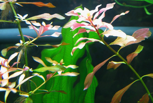 но при сильном освещение верхушки многих длинностебелек, в .т.ч. гигрофила приобретают розоватый оттенок. ну и неизвестно под какой лампой фотали. растительные лампы здорово искажают цвета. )