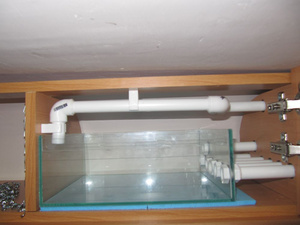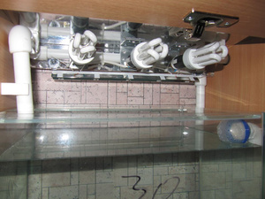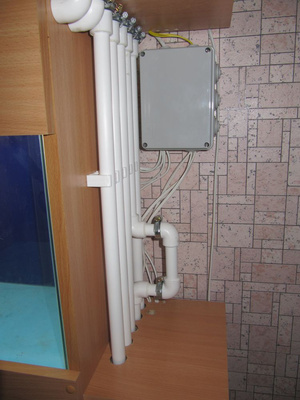 Раздаточная емкость, куда помпа будет подавать воду из сампа по верхней трубе. Потом вода самотеком должна идти в 5 аквариумов. Еще один слив чуть повыше - на всякий пожарный, идет обратно в самп. Честно говоря, делал всё чисто интуитивно, никаких расчетов не делал. Исходил из следующего: от помпы будет хороший напор, но 5 сливов самотеком вполне должны справиться, в крайнем случае на трубе от помпы есть кран, которым можно отрегулировать поток. В дальнейшем есть планы добавить автоматику включения/отключения помпы, но это пока в стадии разработки и экспериментов, внедрять буду уже на рабочей системе, ибо уже зудит всё запустить....
