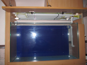 сваял небольшой подвесной светильничек с 4 синими светодиодами (читал, что синий свет не сказывается на благополучии рыб, не знаю, правда как на растениях аукниется, но, ить всегда можно будет выключить, зато ночью можно будет по коридору шарахаться без опаски на грабли наступить, да и понаблюдать за ночной жизнью обитателей прикольно)