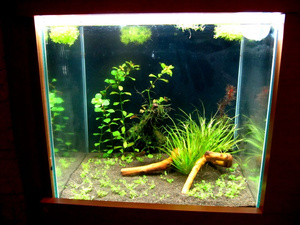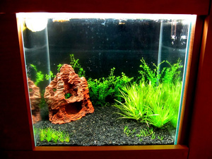 Насыпал грунn ADA, мелкий почти черный, спецом, чтобы куба росла... Обмотал часть коряжинки яванцем, сваренной недельку назад, а срезанную еще по осени на отжиге СФ в Речкуновке (кажись калина). Натыкал несколько пучков кубы, выросшей сушкой. В раскорячку коряжки посадил японскую бликсу. На задний фон воткнул два вида людвигии и еще какую-то травку, похожую на роголистник, но не он, почти красного цвета. Првда эта травка полуживая, не знаю, примется ли. Ну и остатки риччии бросил.