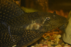 У птеригоплихта появилось большое белое пятно(от начала морды до левого грудного плавника) как на фото только большое и без красных подтеков. Отсадил, дальше что делать незнаю...