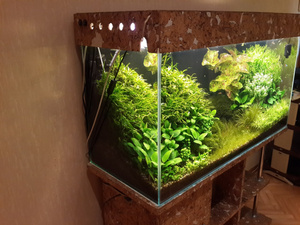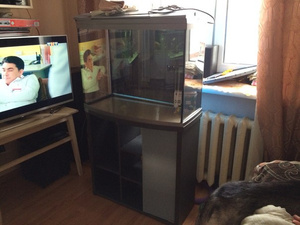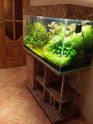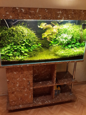 Доброго времени суток, всем присутствующим! Имеется аквариум+тумба+крышка+оборудование+наполнение+население. В связи с аллергией у ребёнка, вынужден отказаться от любимого хобби. Аквариуму 6 лет. Делался для себя. Габариты: Высота 58, с тумбой 138; глубина 55; длина 120. Тумба разделена на 3 отсека по 40 см каждый. Дно войное, "плавающее". Оборудование: внутренний биофильтр немецкой компании Juwel, водонагреватель Tetra, и китайская помпа для дополнительной фильтрации, но по большей части для аэрации, электронный таймер, который позволяет забыть о ежедневном включении и выключении света в аквариуме. Освещение, есть как в крышке, так и отдельное ЭПРА, которое расположено на покровном стекле аквариума. Наполнение: кварцевый песок, галька речная мелкая, камень песчсаник пещеристый, ещё пара-тройка камней(не вспомню сейчас как называются), коряги мангровые. Растения живые. Рыбы: цихлазомы чернополосые и они же альбиносы, мастацембелус. Цвет темное дерево. Задний фон, чёрный.ПРОДАНО!!!