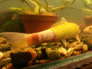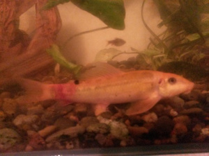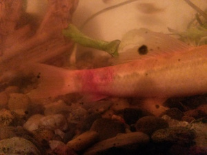Спустя 3 дня следующие результаты: сом начал помаленьку плавать, но хвост особо не работает, плавает рывками, хотя спину гнет. Но печалит другое: там где было основное красное пятно чешуя вся слезла, сейчас белый налет и чешуя на кончике хвоста и перед плавником тоже вздыбилась. Нижний плавник толи гниет, то ли мелкие рыбки обкусали. Остальные плавники нормально. Выглядит рыбка жутковато. Самое плохое что сегодня обнаружила что у другого сома в аквариуме-торокатума кажется тоже начал гнить немного плавник. В остальном рыбка нормальная. Сегодня залила сера бактопур. Попыталась сфотать сома чтобы показать масштабы проблемы. Помогите пожалуйста советом- я уже если честно в панике и совсем не знаю что делать дальше