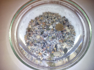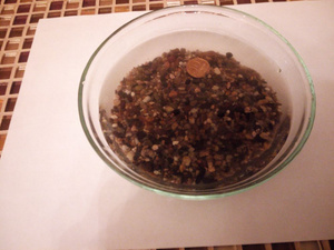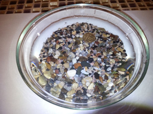 2) Грунт натуральный. Покупался под каким-то названием, которое уже и не упомню. Основная фракция 1-3мм, есть вкрапление более крупных камушков. Грунт заилен (взят из рабочего аквариума). На фотке - промытый. Также в грунте есть панцири от улиток-меланий (вероятно есть и просто дохлые, но это решаемо либо механическим удалением, либо прокаливанием в духовке). Никакой паразитической флоры и фауны. Объем около 3 литров (оптимально для банки 20-30 литров). 100 рублей.